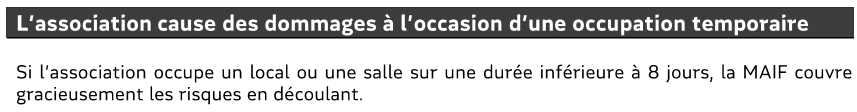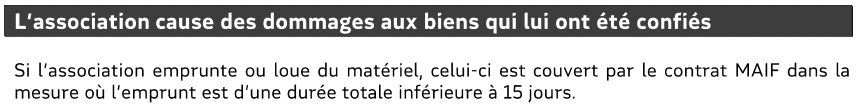 Pour cela vous pouvez contacter notre tresorier@ffjdr.org pour lui faire part de vos besoins (occupation permanente d’un local, assurance des jeux, décors…. ) , ce qui permettra le calcul du cout de l’assurance des biens. - Si ce forfait « assurance des biens » a été souscrit et si les biens de l’association sont endommagés de manière accidentelle, la MAIF indemnise l’association